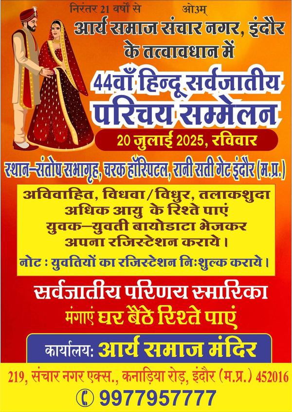 Arya Samaj Mandir-Arya Vivah Arya Samaj Mandir – Arya Vivah Services in Indore, Gwalior & Bhopal At Arya Samaj Mandir, we are committed to offering genuine and spiritually meaningful Arya Samaj marriage ceremonies in Indore, Gwalior, and Bhopal. Grounded in Vedic traditions and the teachings of Swami Dayanand Saraswati, our focus is on conducting simple, lawful, and respectful marriage rituals ...